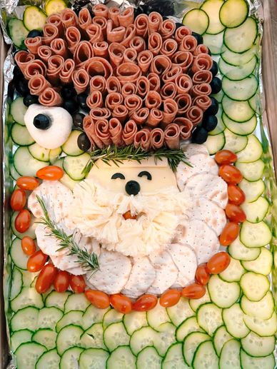 This handcrafted platter is arranged in the shape of Santa Claus, featuring: