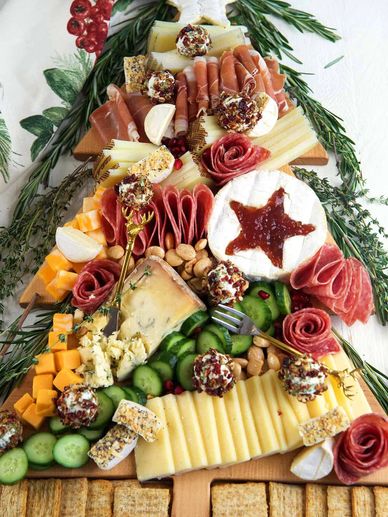 Expertly arranged in the shape of a Christmas tree, this gourmet board features: